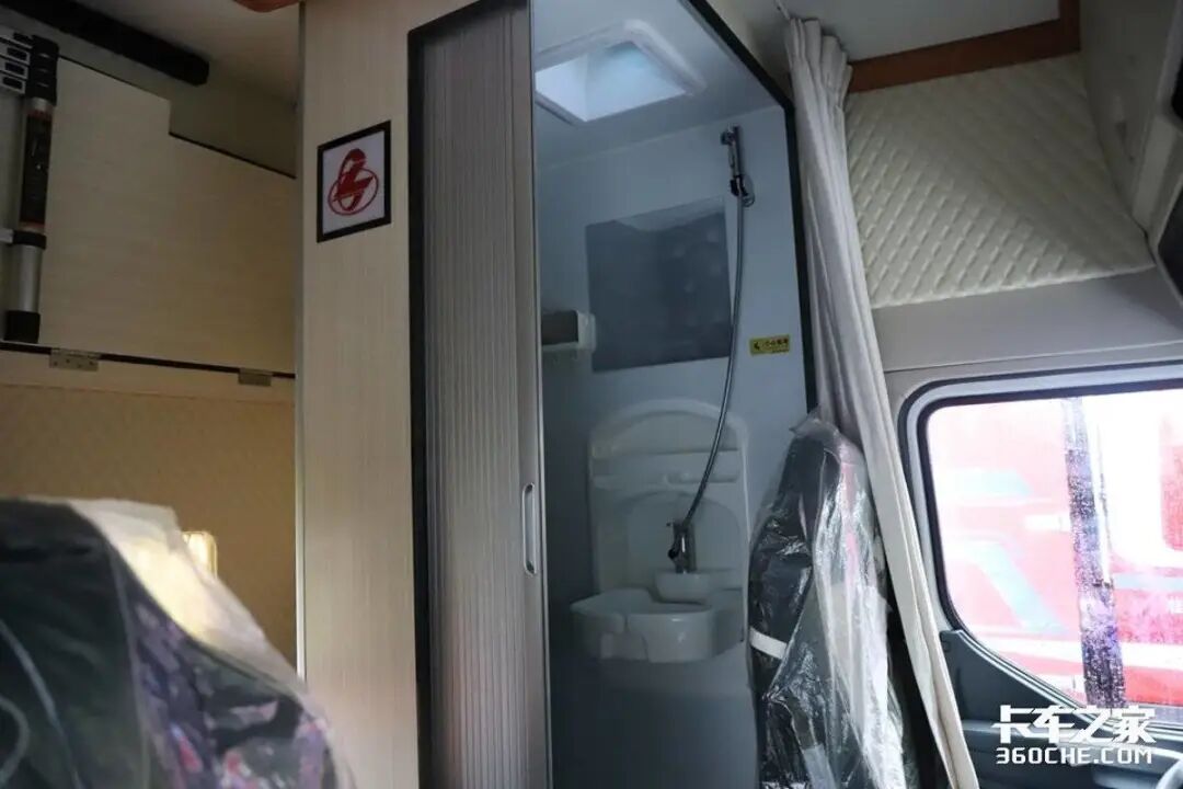 在跑长途的时候,最难解决的就是洗澡问题。尤其是夏天,白天出了一身汗晚上还没地方洗,睡起来也难受。而这款车最令人惊喜的是,它在主驾驶后方还设置了一个独立的卫生间。通过隔断来达到干湿分离的效果。