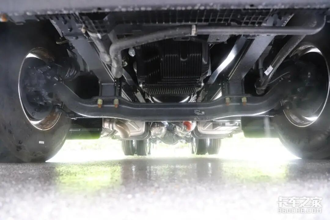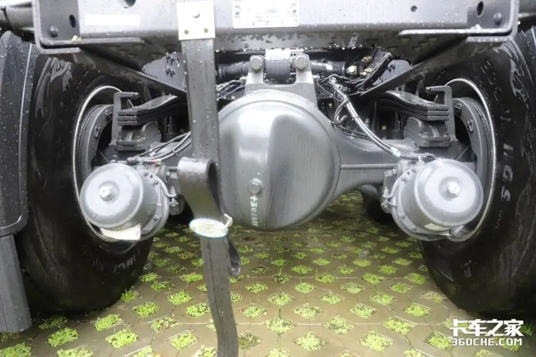 在底盘方面,实拍车装载的是轻量化德纳双440后桥,后桥速比为3.417,并拥有康迈免维护轮端设计。