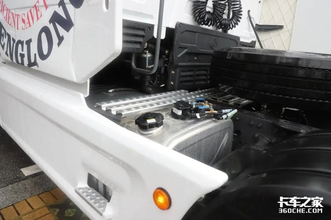 底盘两侧均装有侧裙板,一方面是降低行驶风阻,另一方面是为油箱等部件提供一定的保护。这款车采用了双油箱设计,两者可以提供1050升的超大容量,可以轻松应对跨省长途运输任务。