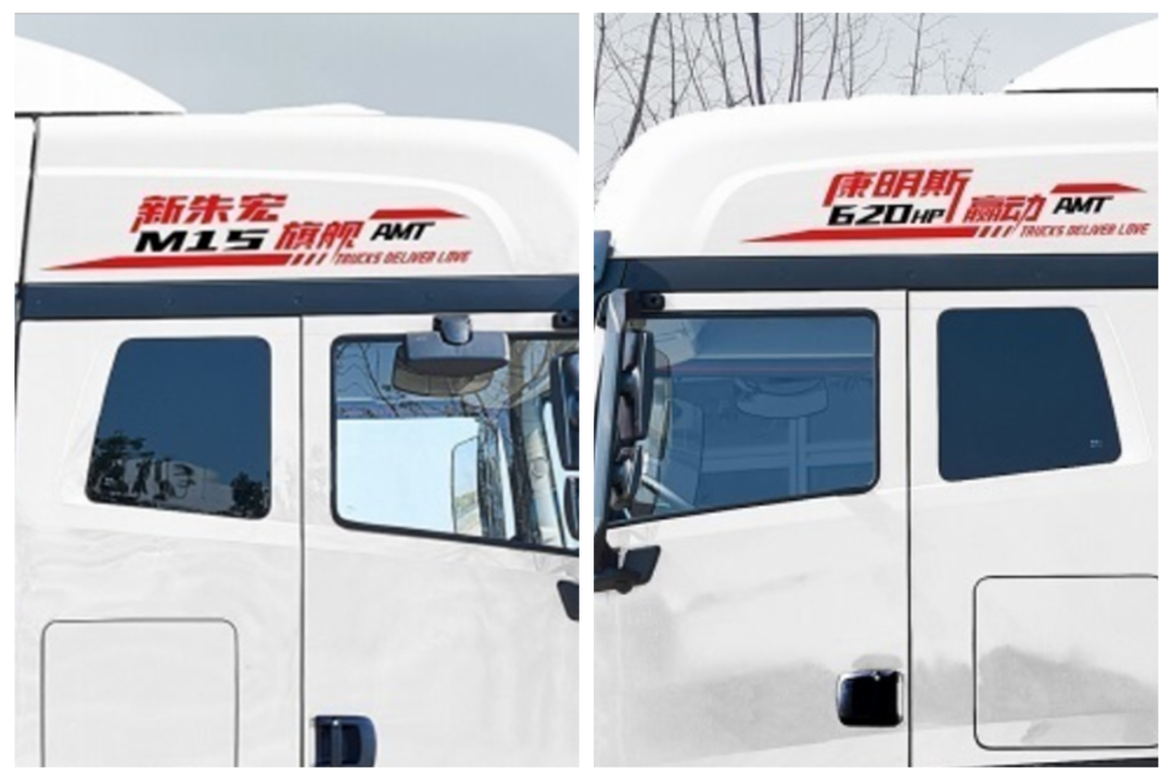 驾驶室左侧上方的贴纸拉花,为“康明斯620HP 赢动AMT”字样的贴纸拉花,展示了“新朱宏”车型搭载的强大动力链。