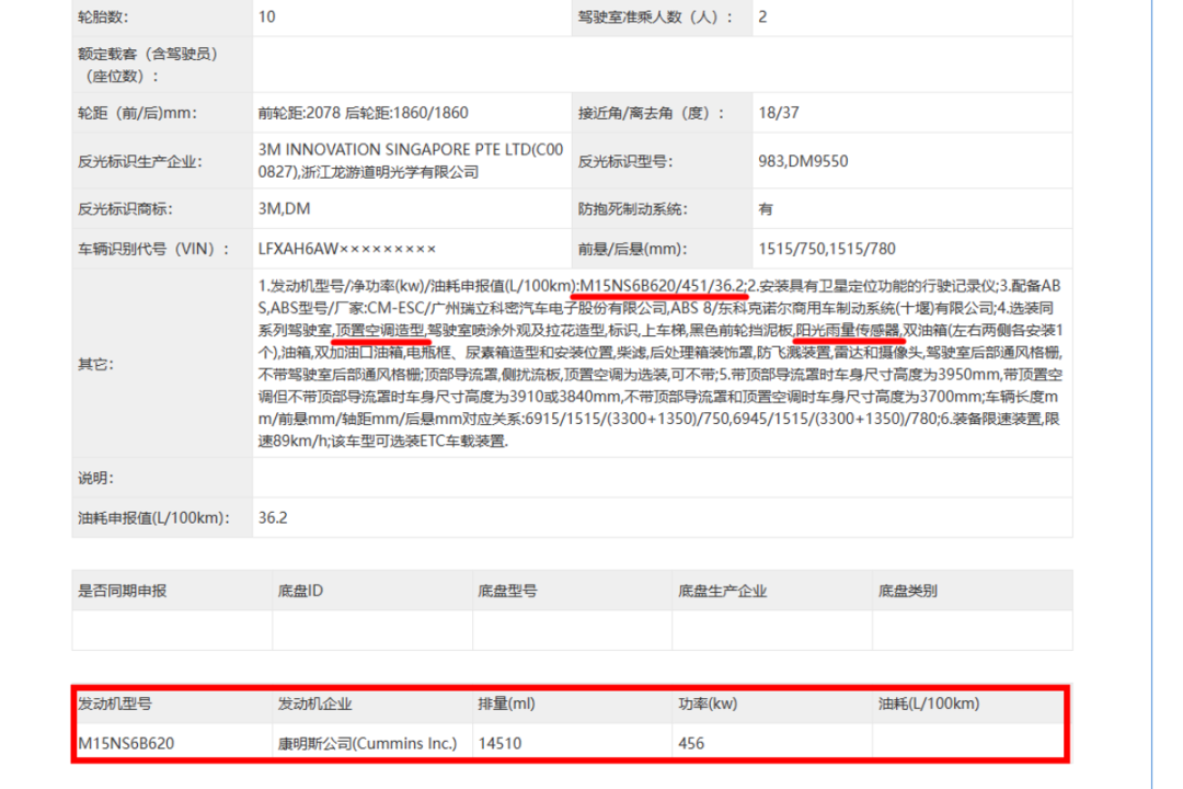 从车型公示详情中可以发现,三一“新朱宏”牵引车搭载了型号为“M15NS6B620”的康明斯发动机,排量达到了15升级别(14.51升),并且该发动机输出功率高达456kw(620马力),油耗申报值为36.2(L/100km)。