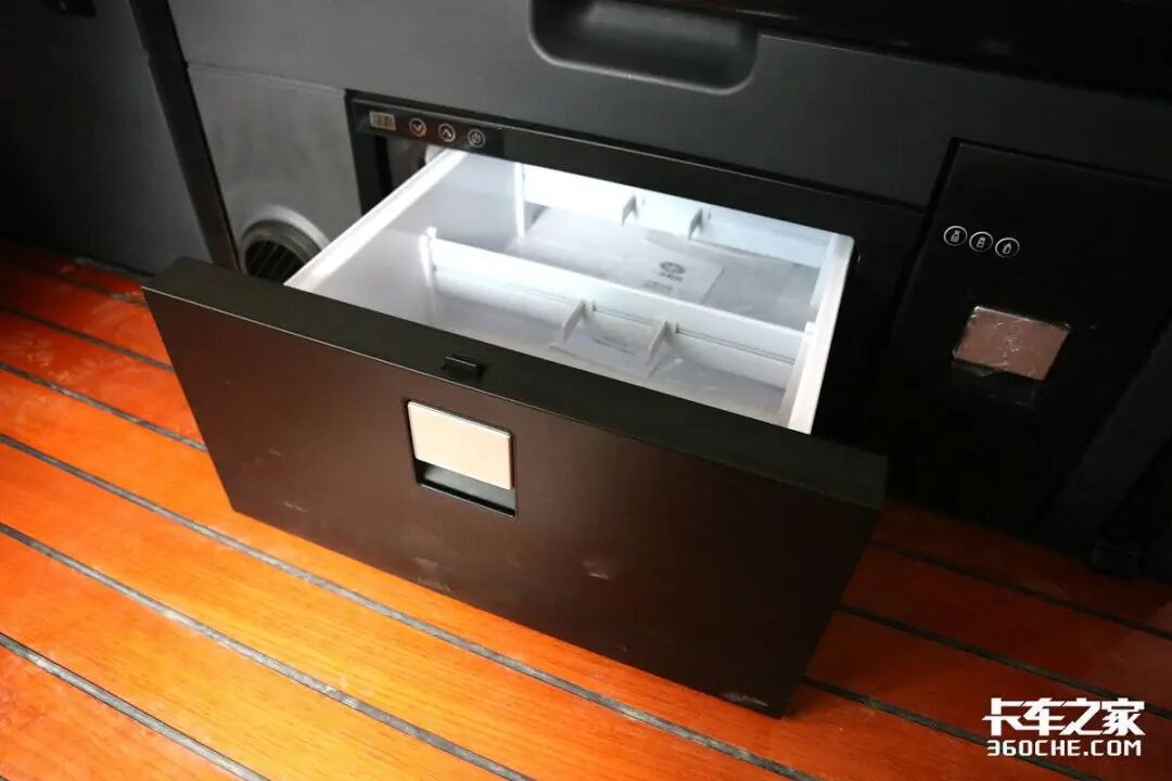 由于驾驶室空间足够奢侈,所以鹰途头等舱有很多可以利用的空间,比如卧铺下方带有冰箱设计,可以在休息以及停工时,吃上一顿较为新鲜的饭菜。搭配上整体内饰所营造出的氛围感,仿佛有置身家外之家的感觉,让卡友在日常休息中能够更加温暖。