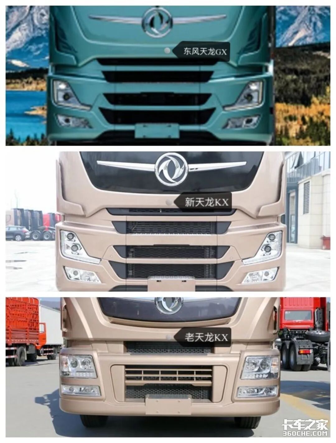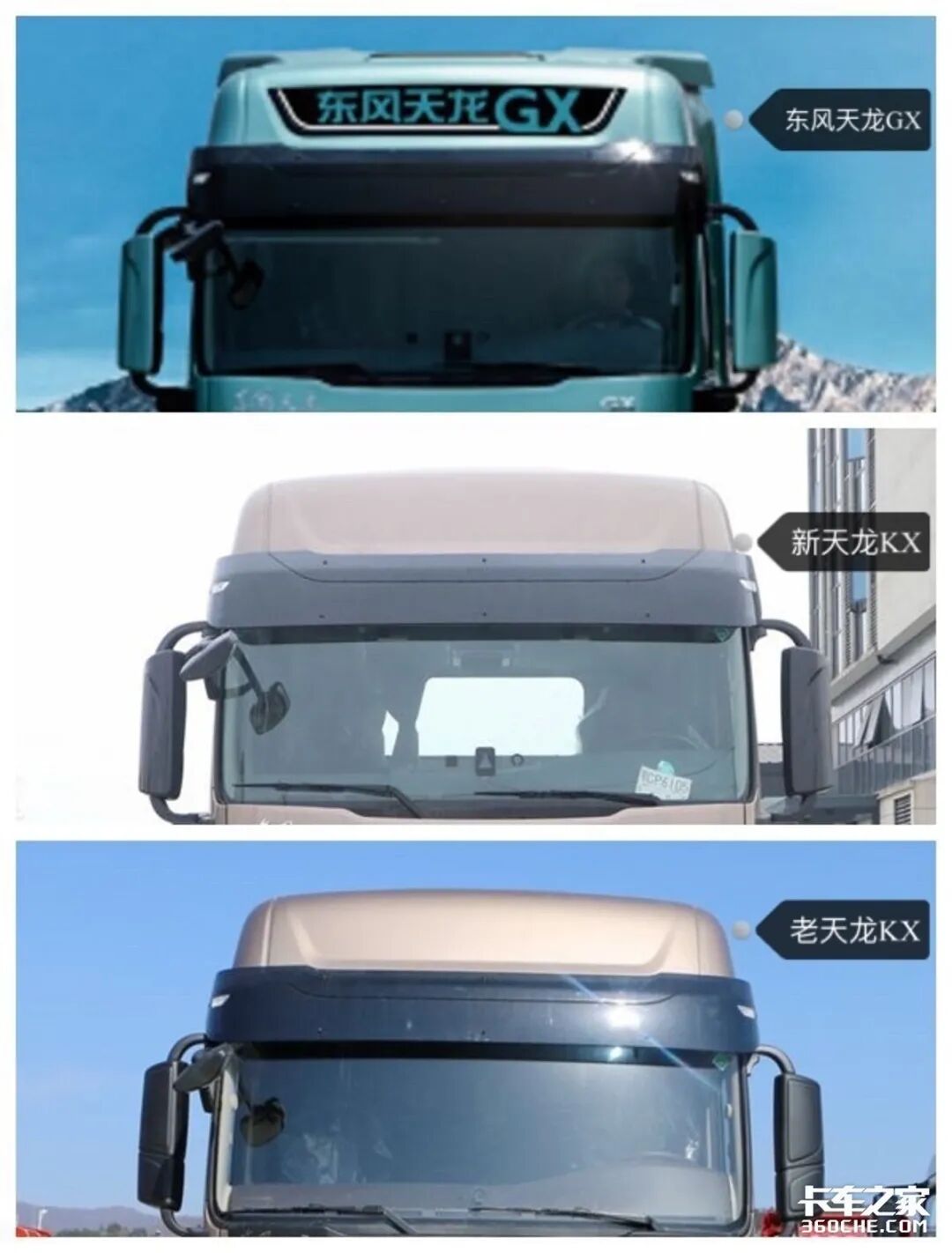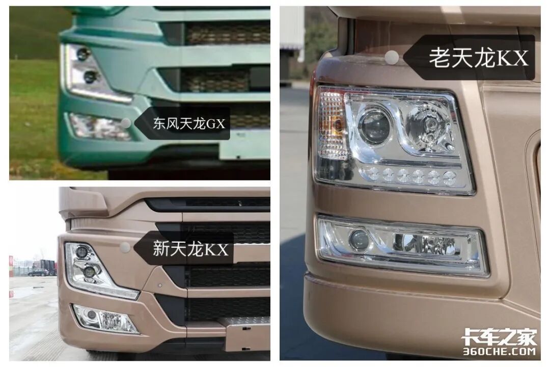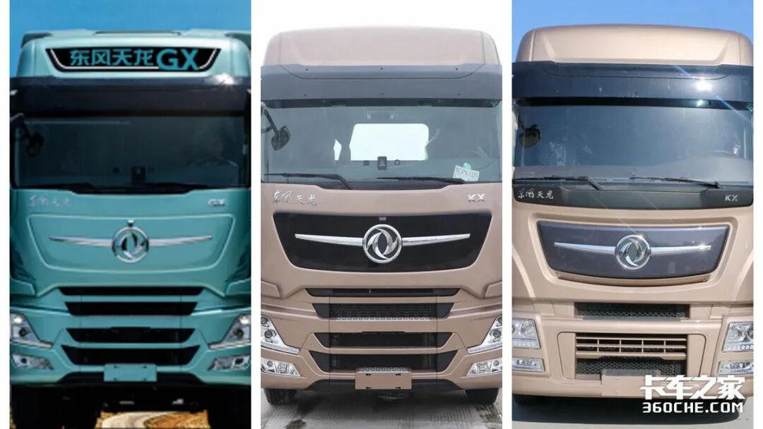 上图从左到右依次为东风天龙GX、新天龙旗舰KX以及老天龙旗舰KX,单从外观上来看。小编认为东风天龙GX给人以灵动、现代的感觉,整体设计更加偏向于年轻卡友的喜爱。新天龙旗舰KX看起来更加的犀利,和天龙GX相比没有太大的区别,主要是配色、中网上方的面板以及导流罩的差别。老天龙旗舰KX则是走的成熟稳重风,设计看起来比较四平八稳。