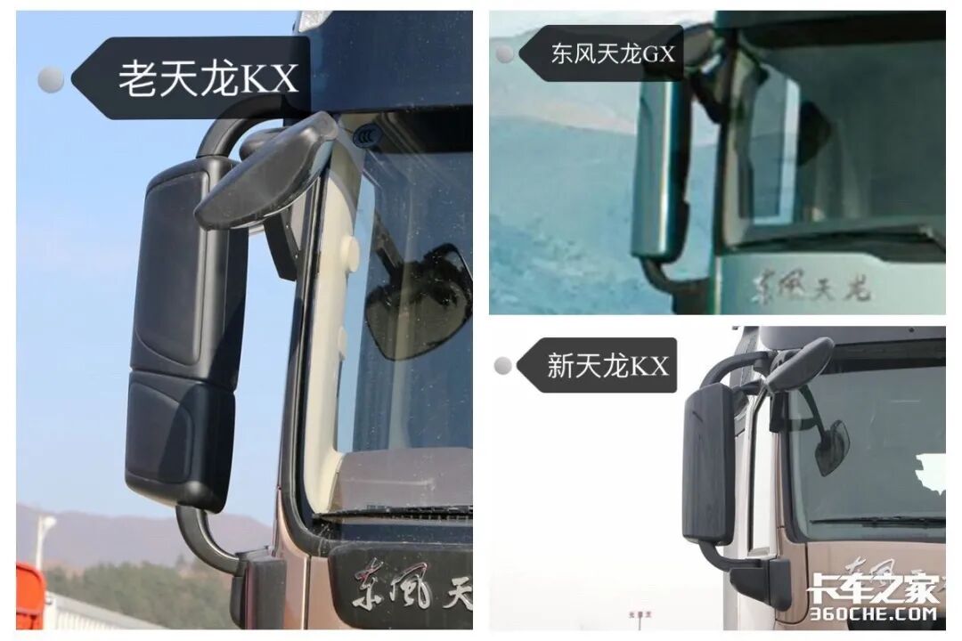接着我们再来看后视镜这一部分,之所以将老天龙旗舰KX的后视镜单独放大图,是因为东风天龙GX其实和新东风天龙KX无甚区别,都是选用的光面材质,不同的是,东风天龙GX的后视镜配色同整个前脸保持了一致。再来看看老天龙旗舰KX的后视镜,可以看到它使用的是磨砂质感的黑色塑料外壳包裹,相较于另外两款来说略显不足。