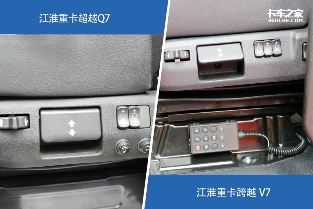 这两款车型的变速箱操作机构都是集成在主驾座椅上,这样设计既方便驾驶员更舒服、顺手的换挡,还助于驾驶员出入副驾驶及卧铺。只不过这两个变速箱操作机构的造型略有不同,超越Q7的变速箱操作机构造型类似“飞机档把”,而跨越V7则类似于“鸡腿档把”。