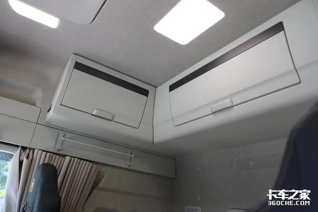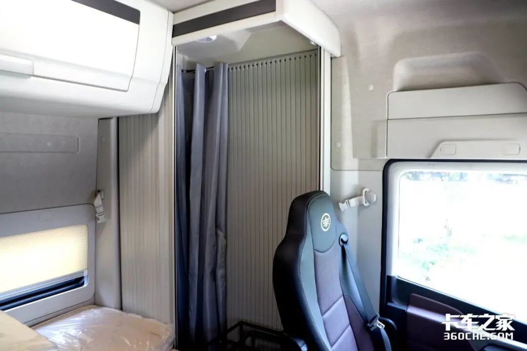 和内饰设计一起提升的还有全新的驾驶室,解放鹰途头等舱采用了目前国内平头卡车中最大的单体驾驶室,内部空间能够达到接近5平米的空间表现,对于一台卡车来说这样的空间无论是储物还是日常居住生活都不会有任何不适。