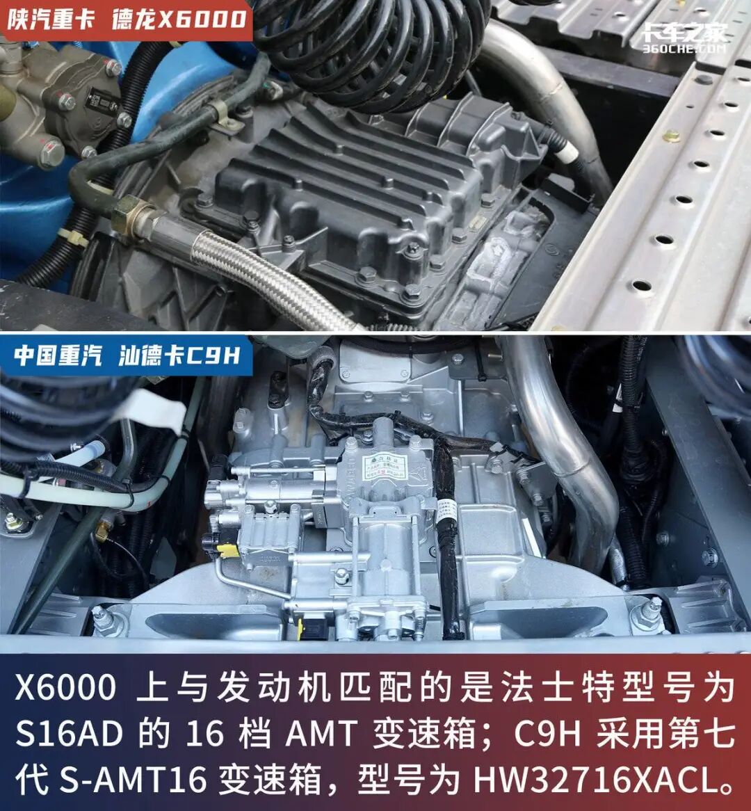 变速箱方面,X6000上与发动机匹配的是法士特16档AMT自动变速箱,是型号为S16AD的铝壳变速箱。C9H上与发动机匹配的为中国重汽第七代S-AMT16变速箱,型号为HW32716XACL。