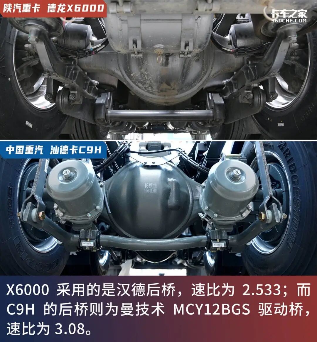 X6000的后桥采用的是汉德后桥,速比为2.533;而C9H的后桥则为曼技术MCY12BGS驱动桥,速比为3.08。