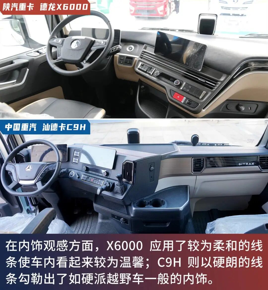 虽然两车都搭载了800马力的潍柴大马力发动机,但两款车还是有着不小的差异化,陕汽重卡德龙X6000搭载的为800马力潍柴发动机+法士特AMT+汉德车桥的动力链,汕德卡C9H则搭载800马力潍柴发动机+中国重汽S-AMT+曼技术车桥的动力链。此外,两款车在底盘布局、内饰设计方面都显现着不同的风格。