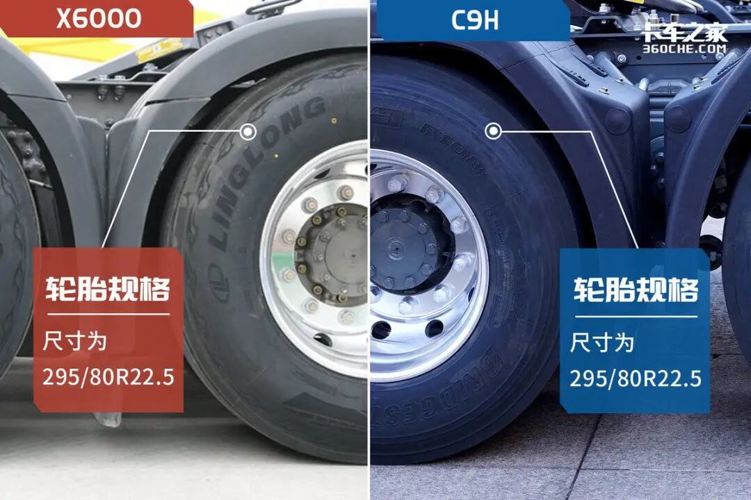 X6000全车采用了玲珑品牌的ECO-WINGS系列295/80R22.5规格的轮胎,具有低滚阻、耐磨、寿命长的特点;汕德卡C9H全车为普利司通295/80R22.5规格的低滚阻节能轮胎,对于长时间在高速上飞奔的牵引车而言,节能、耐磨且舒适的高品质轮胎也非常重要。