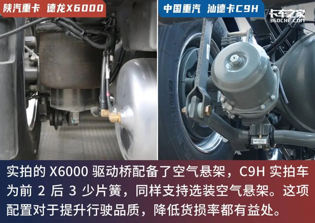悬架方面,实拍的这台X6000其驱动桥采用了空气悬架,C9H的实拍车采用了前2后3的少片簧悬架,不过其同样支持选装空气悬架。空气悬架对于提升行驶品质,降低货损率都非常有帮助。