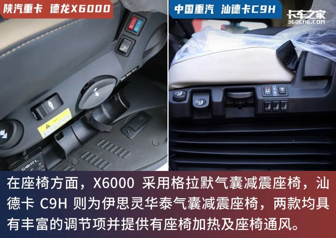 作为行驶中相伴最久的配置,气囊减震座椅的重要性不言而喻,在这方面两款车都不会让人失望,它们均装配了知名气囊减震座椅生产商所生产的产品。X6000选择了格拉默品牌气囊减震座椅,而C9H则使用了伊思灵华泰气囊减震座椅,两款座椅都配备了座椅通风及座椅加热功能,卡友们即便面对酷暑寒冬都不怕了。