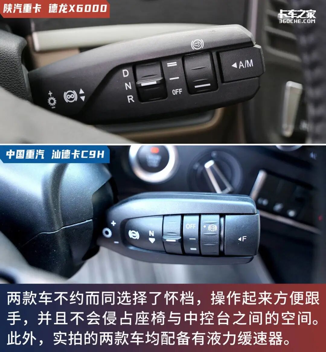 在这一环节,两款车可谓“英雄惜英雄”,都采用了便捷且不占用过多空间的怀档操作方式,且均配备了液力缓速器,这也是山区及高原干线物流运输场景所看重的配置。其中汕德卡C9H采用了怀档+旋钮按键的操作方式,通过旋钮可以在动力模式、经济模式及爬坡模式中自如切换。