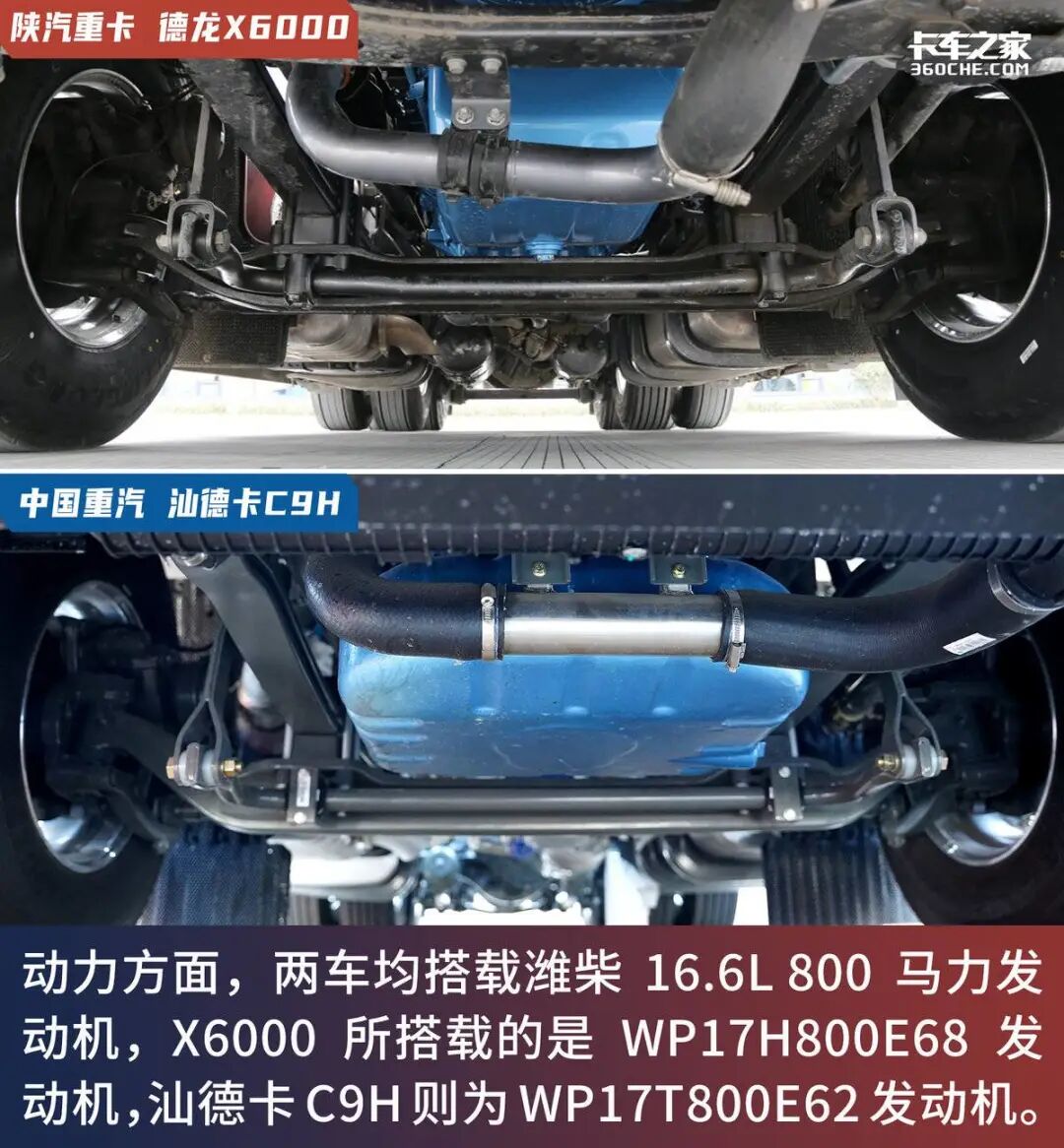 C9H所搭载的是WP17T800E62柴油机,同样可输出800马力,峰值扭矩3750N·m并满足国六排放标准。WP17T发动机是潍柴与中国重汽深度融合,并针对于中国重汽车型所打造的T系列专属动力。虽然两款车选用的是不同平台的产品,但各项数据基本一致,在这一环节两款车表现可谓不相上下。