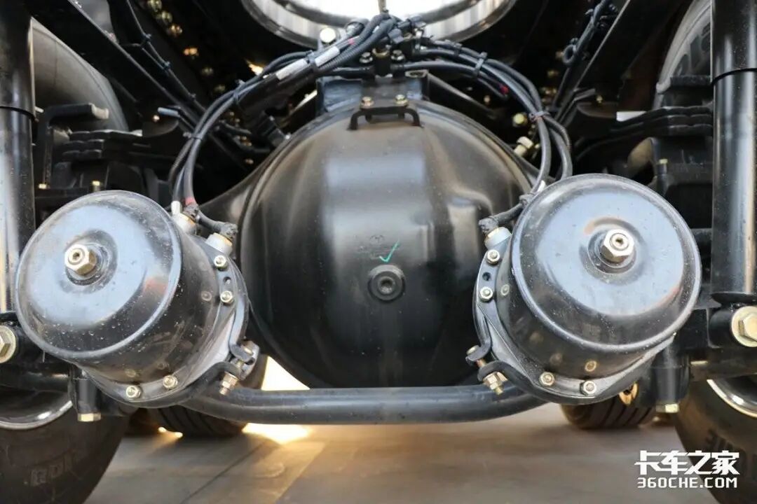 在底盘配置上,这款德龙X6000前后桥均采用的是汉德的产品,制动形式为前盘后鼓,其后桥速比为2.533,非常经典的大马力小速比动力链组合,据了解该车的动力传动率可达99.7%以上。该车悬架形式为前2后3的板簧悬挂,也可以选择空气悬架,如此以来不仅能利用甩挂提供运输效率,气囊桥也能一定程度上降低车辆自重,减少行车过程中的颠簸,以此降低货损。