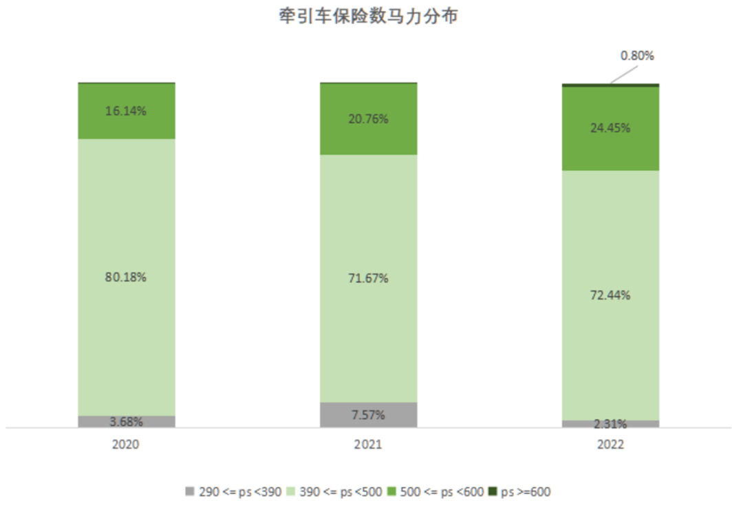从2020-2022三年的重卡牵引保险数据来看,500以上马力段占比逐年上升,500-600马力段的占比从2020年的16.14%上涨到24.45%,600及以上马力段的产品也从0上升到0.8%。