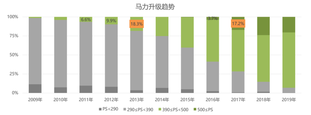 另外,据卡家咨询研究院统计,今年1-2月的询价数据显示,有10%的人在询价完500马力段的产品之后又对600马力段的产品进行了询价,可见大马力车型受欢迎程度加强。