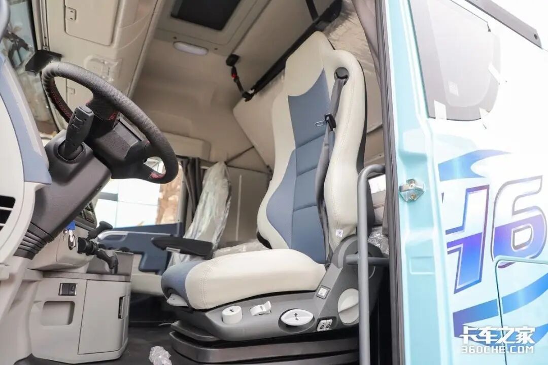 内饰部分,解放JH6智尊版全面焕新升级,车门内饰板、仪表台、座椅的配色,都采用的是让人心情愉悦的蓝色,再加上浅色部分的搭配,内饰氛围瞬间拉满!为了给到卡友们更加舒适的驾乘环境,实拍的这台解放JH6的驾驶室采用了四点气囊悬浮的悬挂形式。搭配上主驾的格拉默气囊减震座椅,即使是经过较为颠簸的路段时,也能给到驾驶员一个较为平稳的驾乘环境。