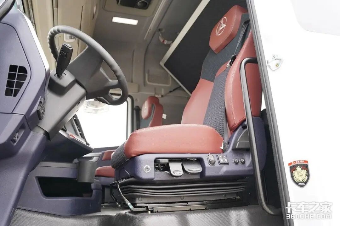 为了给到驾驶员更加舒适的驾乘体验,车辆驾驶室采用了四点气囊的悬浮悬挂,主驾也匹配了皮革包裹的气囊减震座椅,拼接造型动感有有质感。值得一提的是这款座椅除了常规功能外(通风加热、高度阻尼等),还带有10向调节和8点揉搓按摩功能,长时间驾车可有效缓解疲累感。