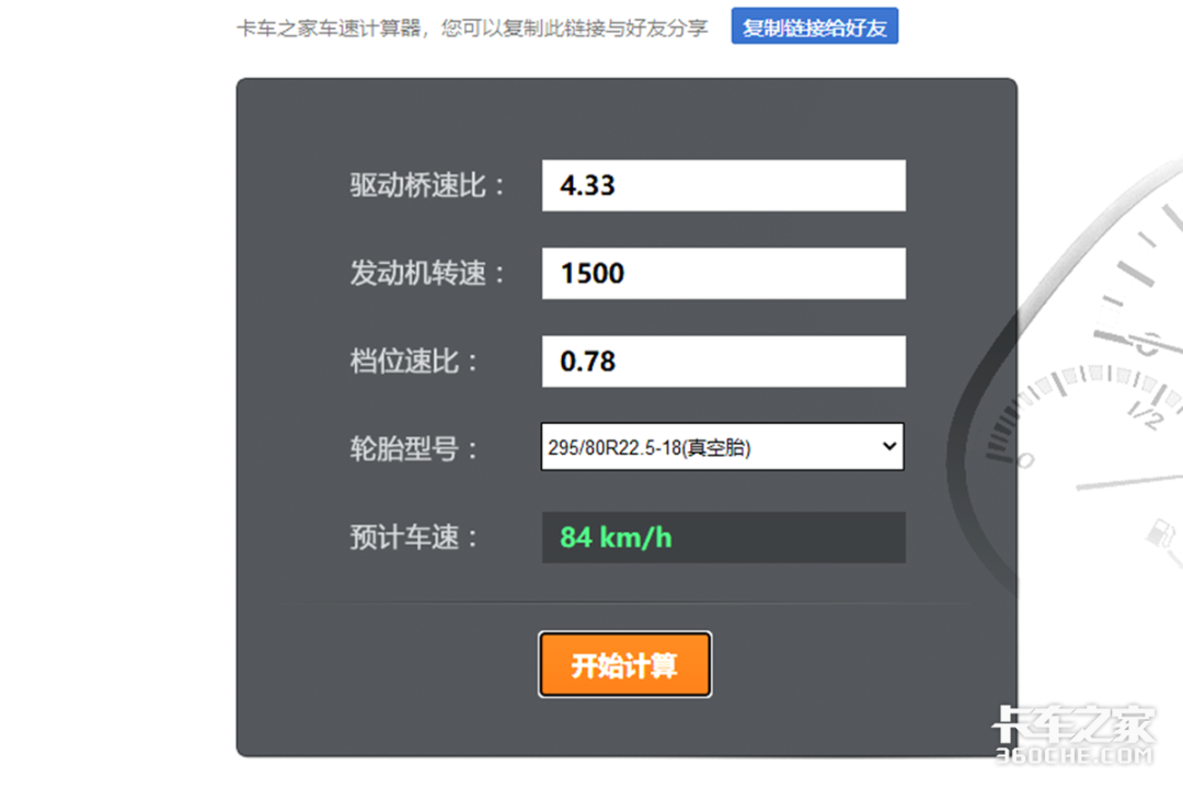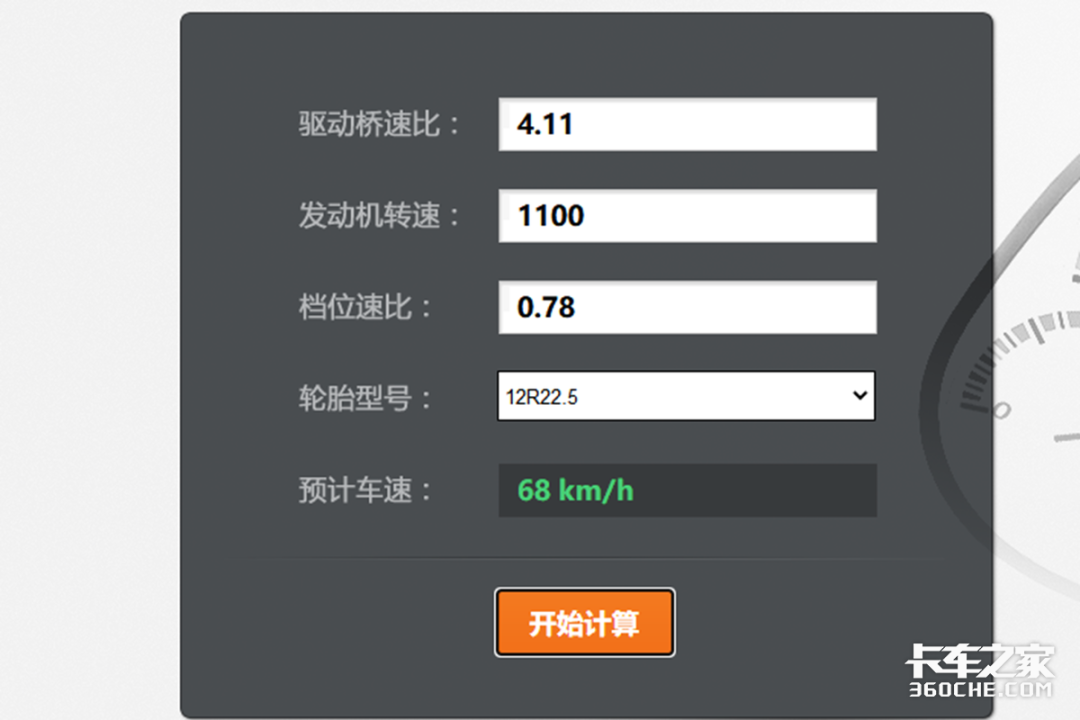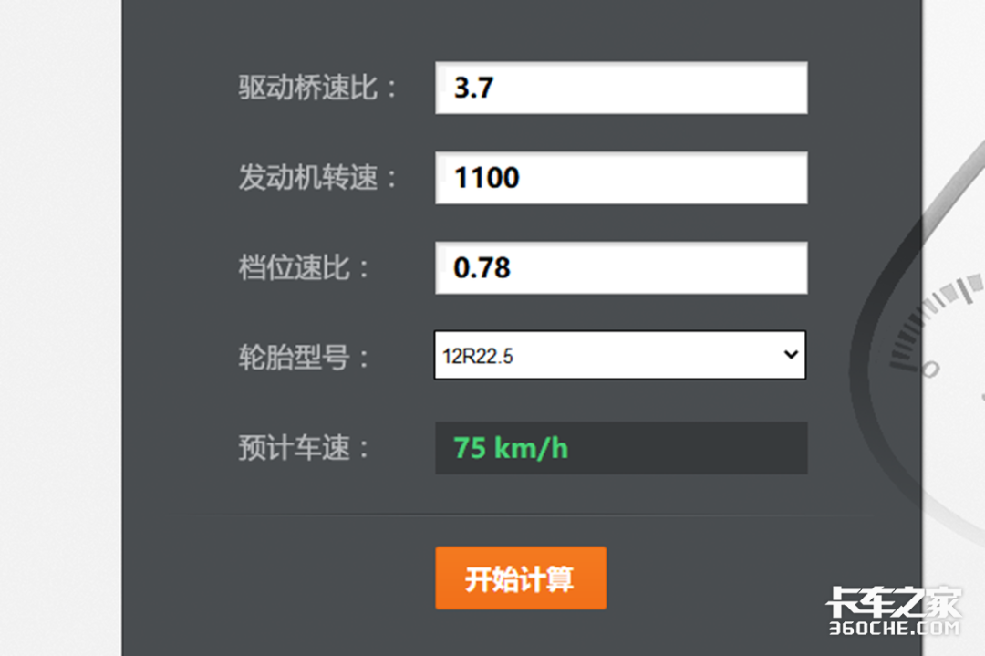 在这也给大家推荐一下卡车之家的车速计算器,可以用来计算车速。大家可以依照自己选好的车辆配置,在其中选择驱动桥速比、变速箱档为速比、发动机经济转速和轮胎型号,计算器将会为大家计算出,在当前转速下,车辆的车速。