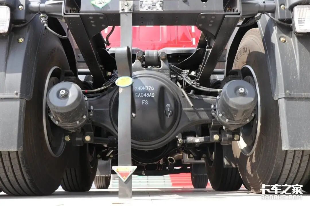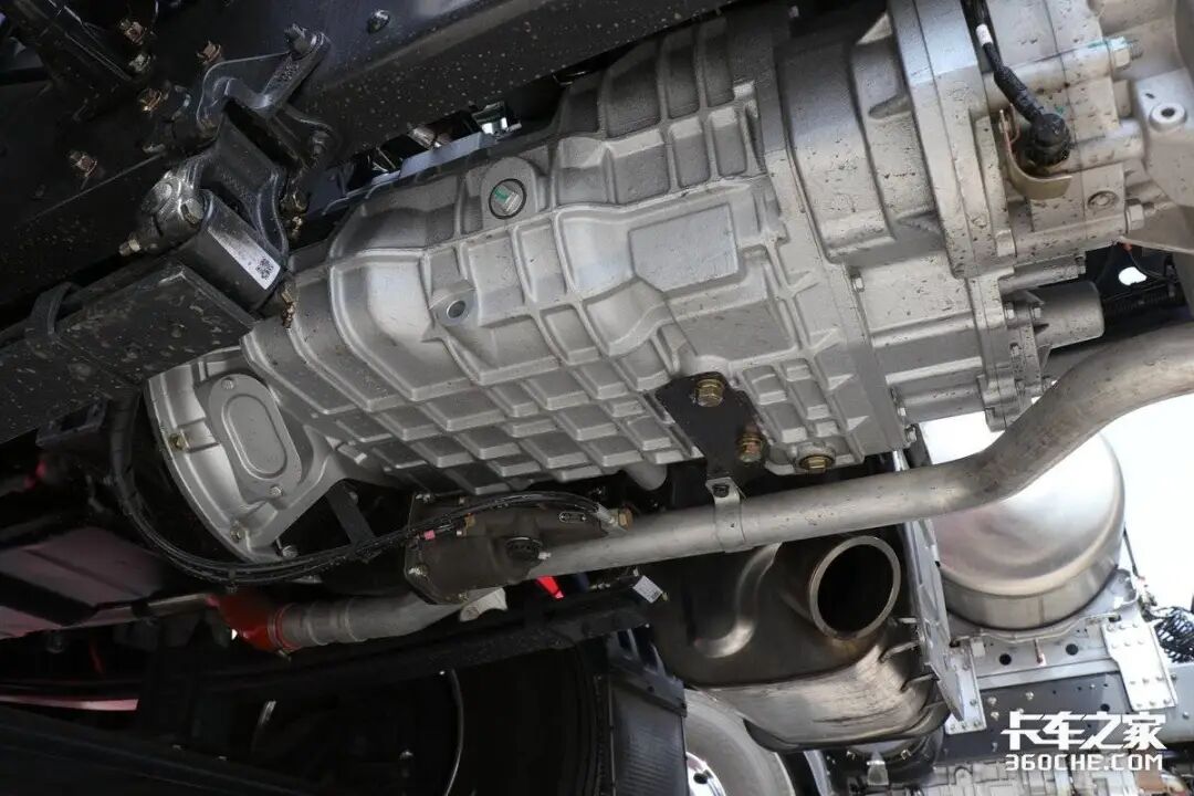 传动系统方面,这款车选用的是法士特12档手动变速箱,型号为12JSDX220TA-B铝壳变速箱,最大输入扭矩为2200N.m,头档速比12.1,最高档速比为0.78。此外,驱动桥速比为3.7。