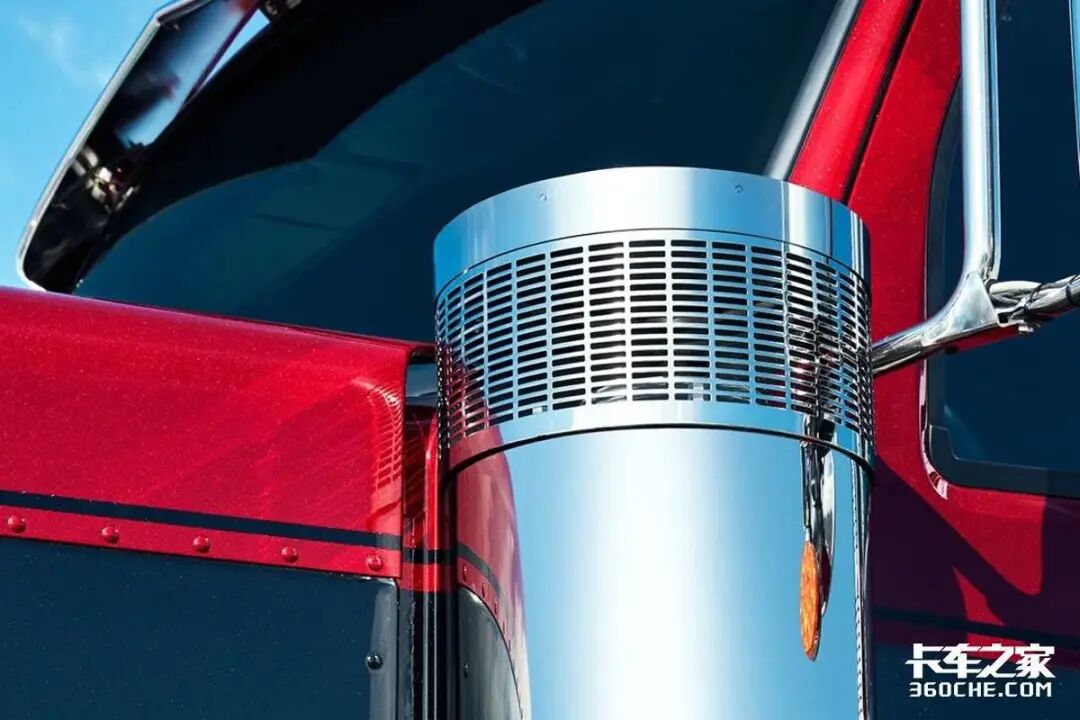 当然,在彼得比尔特389上颇具辨识度的外置空气滤清器也延续了下来,尺寸达15英寸,这样的设计是为了便于日常维护和更换——转动顶盖1/4圈即可看到空气滤清器,不再需要打开引擎盖。而其壳体如同镜面一般“blingbling”的,美式豪华范儿十足。