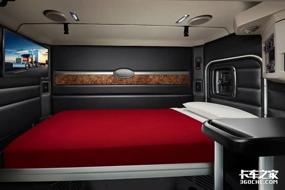 而卧铺区域就更加赏心悦目了,除了有着宽大的床铺以外,589在卧铺后壁上进行了精心的装饰。到处都有大量的软质包覆,在木纹和银色饰板上还有“Peterbilt”的徽章,将奢华属性拉满。而舒适性配置自然也不在话下,在床头和床尾都配备了可调节指向的空调出风口,床头的快捷按键方便操作车内的常用功能,如果装上一台电视那休息时不能再惬意了!