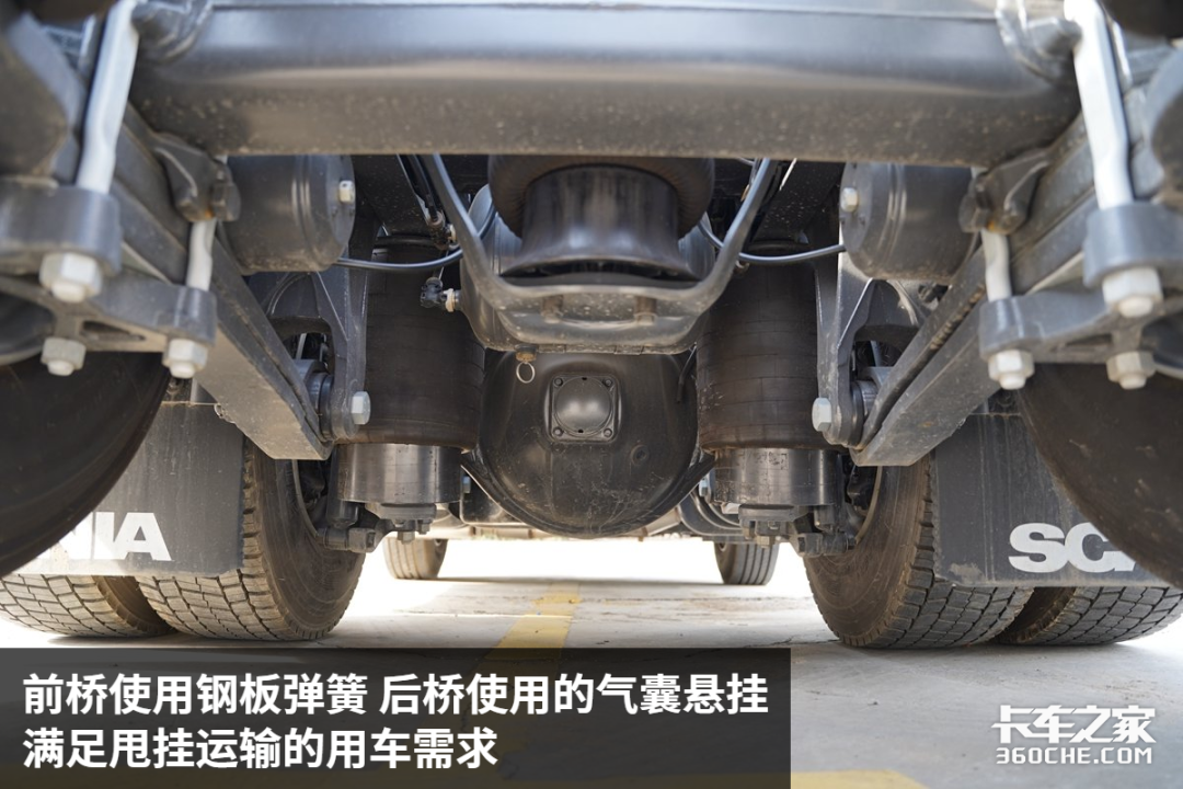 为了尽可能的提高运输效益,可能还会存在甩挂运输的情况,怎么能让牵引头适应多种挂车呢?使用空气悬架是一个不错的选择。所以斯堪尼亚R500在悬架方面,前桥使用的是钢板弹簧,而后桥则使用的是四气囊悬挂,既满足甩挂运输的用车需求,而且配合拖拽臂,车辆在转弯时稳定性也比较好。