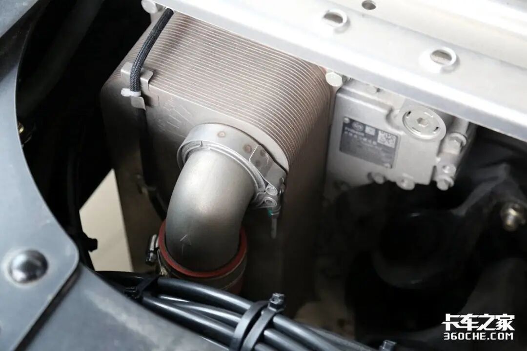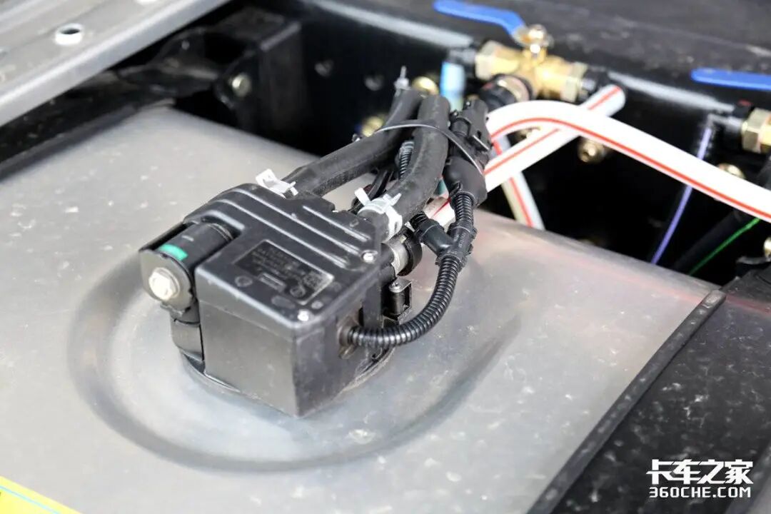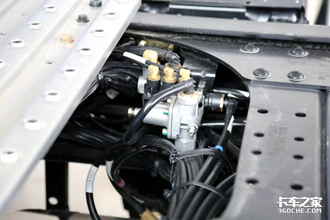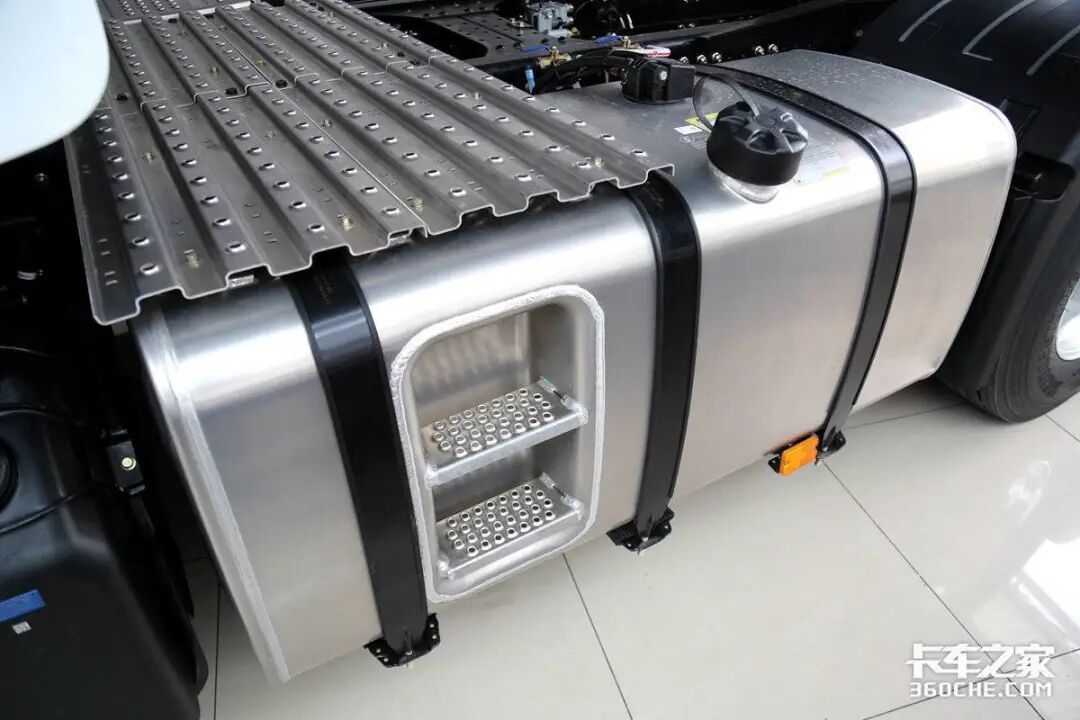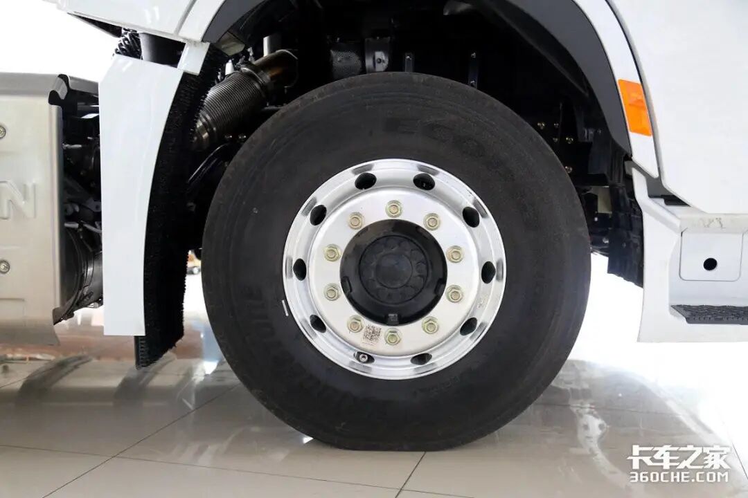 底盘附件区域,左右油箱容积共计1000升,两侧油箱带有水循环加热功能,在外界低温环境下无惧车辆冷启动困扰,并且标配尺寸为295/80R22.5的普利司通低滚阻轮胎,全车可选铝合金车轮用于整车降重。