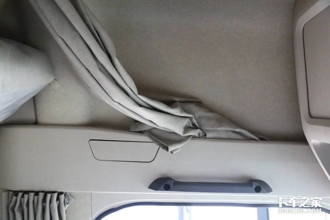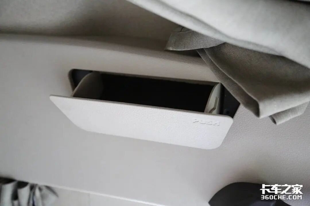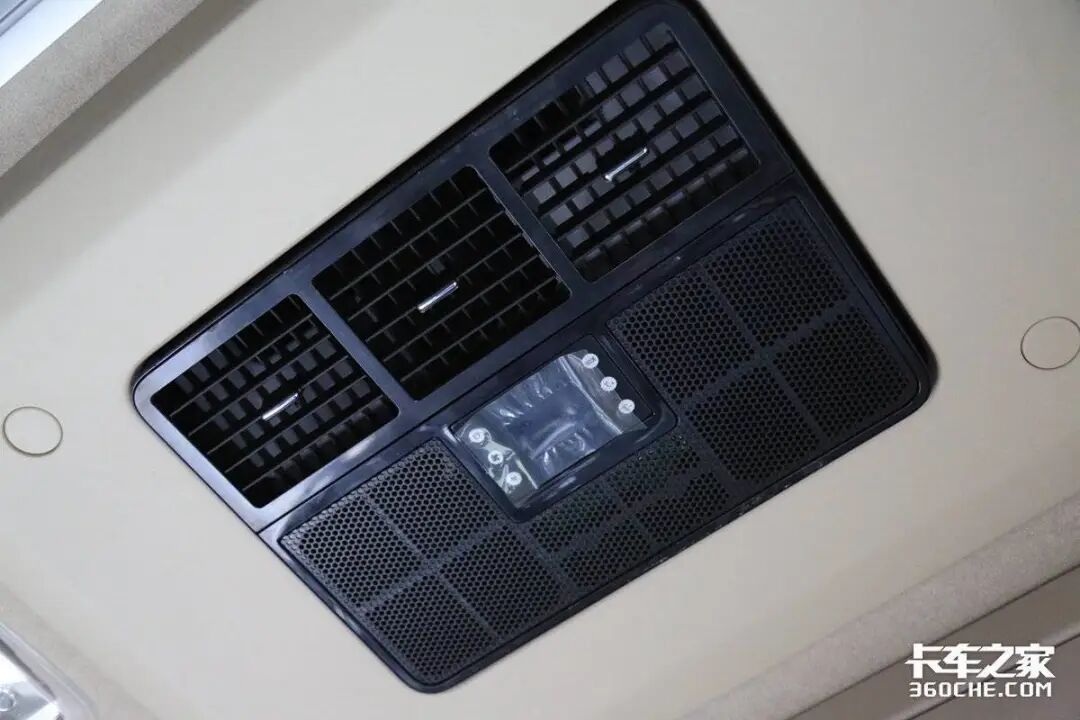 另外,实拍车型选装有顶置驻车空调,对于常年全国奔袭的散户卡友而言,有时候车内环境温度更是能高达40-50度左右,顶置空调在夏季夜晚的实用性不言而喻,强烈建议卡友选装这一配置,让夜晚休息得更好,日间驾驶时更能保障安全性。