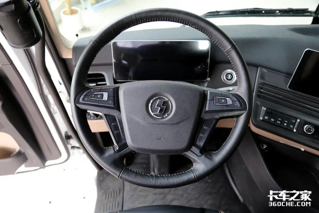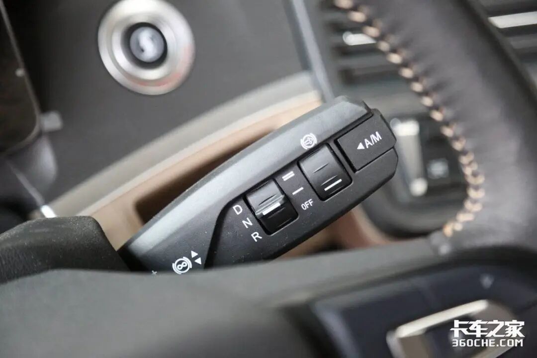 实拍车型采用怀档设计,排气制动、液力缓速器、换档均可在拨杆上控制,根据我们此前走访卡友的结果来看,这一设计在日常驾驶中的实用性和顺手程度目前来看较为实用,而操控相对于传统档把也更为简单。