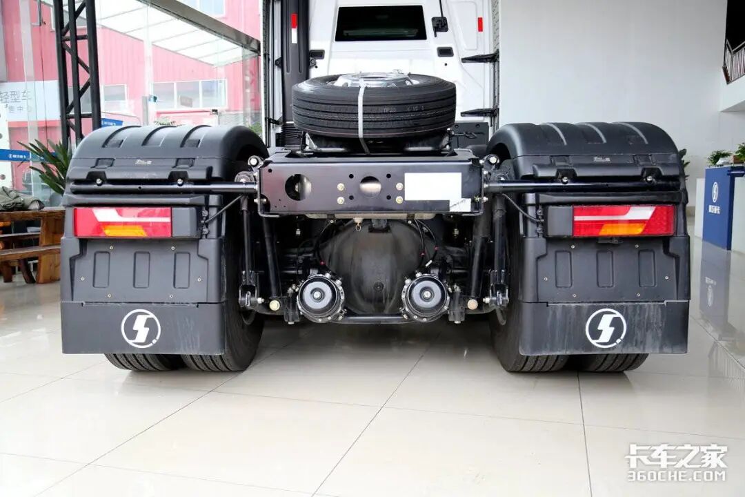 在后桥方面,实拍车型配备汉德SHR-13型号车桥,速比为2.533,同时X6000车型还可选装提升驱动桥设计,可以让6X4车型瞬间变为4X2车型,在空载、轻载状态下有效降低整车的油耗表现。实拍车型为前2后3的钢板悬架设计,后桥标配横向稳定杆,同时车辆可选八气囊空气悬架。