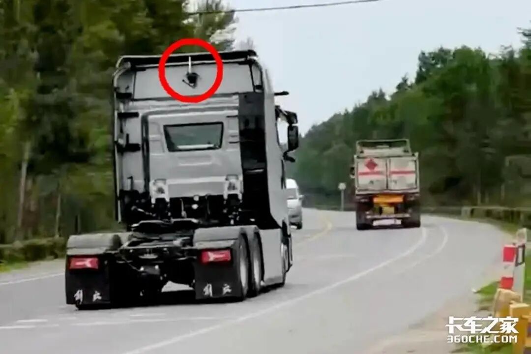 而当这款车驶过后,我们还能看到其或配备有可电动调节高度的车顶导流罩。如若该车配备的可电动调节高度的导流罩,它便能够根据不同的车挂高度快速调节导流罩的角度,让车挂匹配更加快捷和精准。这对于长途高效物流运输而言,无疑是一个提升效率的配置,从此告别手摇。