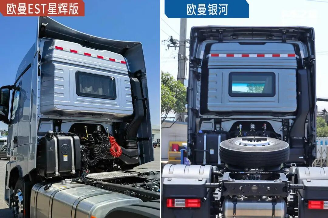 此外在驾驶室后部, 则更能直观的看到欧曼EST星辉版与欧曼银河,驾驶室后部外围凸出尺寸相似,对比银河卧铺尺寸,相信前者驾驶室、卧铺也会有着不错的空间表现。
