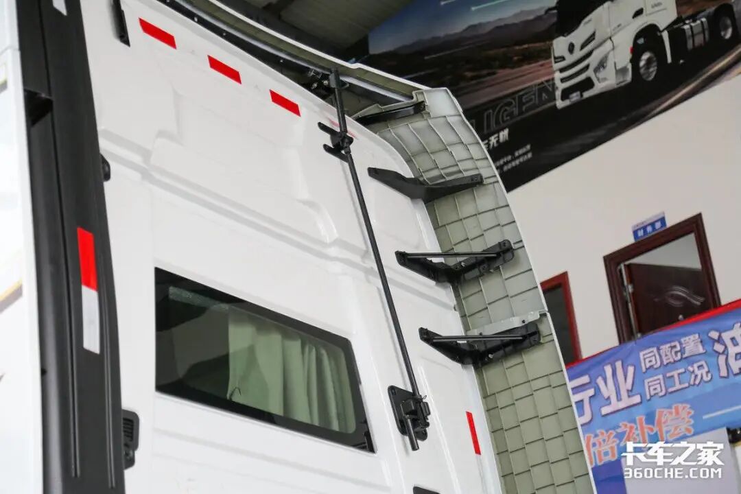另外值得一提的是,该车可以通过导流罩下方的高度调节杆控制车辆导流罩的高低,以适应不同的货厢,能够有效的降低行车风阻,这个配置可以说是十分少见的。