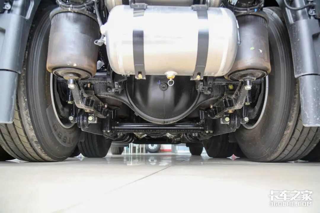 在底盘方面,陕汽X6000采用的是汉德车桥,速比为2.643,后桥采用的是气囊悬挂,相比传统的板簧悬挂,气囊悬挂减震效果更好,能够有效减少货物的运损,方便运输一些高附加值的货物,另外在货物装卸时,通过空气悬架的高度调节,可以让挂车在对接不同高度的货台时,装卸货能够更加方便,并且也方便甩挂。