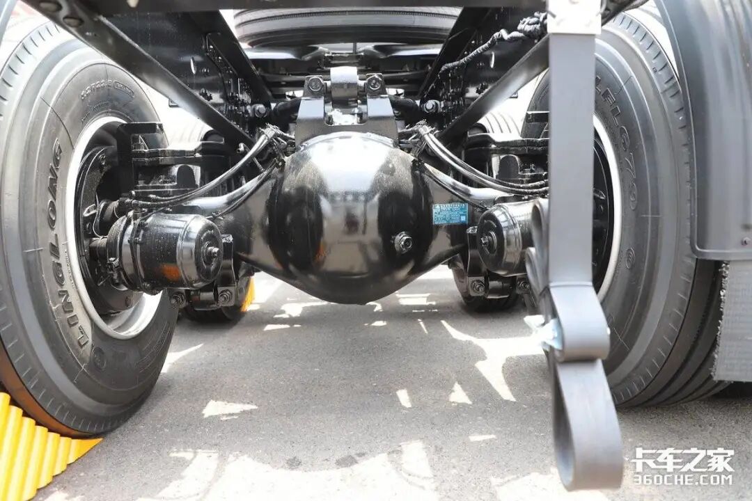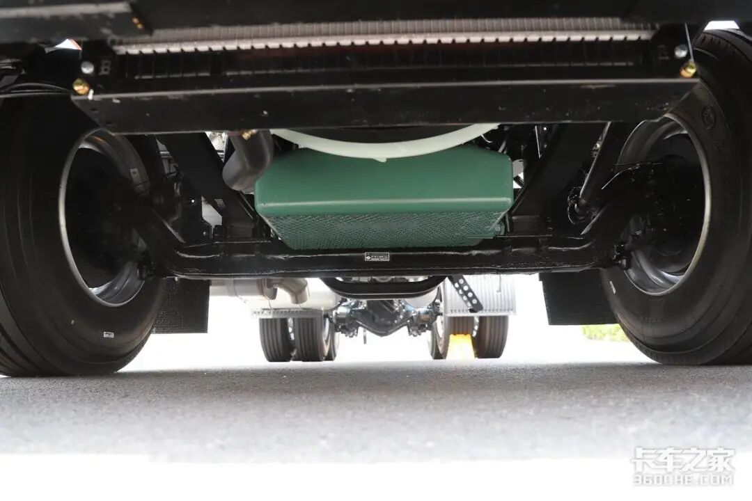 承载力方面,这款车采用的是400冲焊桥,后桥速比为3.7,前后悬架都采用的是2片板簧设计,轮胎规格为12R22.5,整车均采用的是轻量化钢圈,再加上铝合金储气筒等轻量化设计,可以减轻自重,多拉多赚。