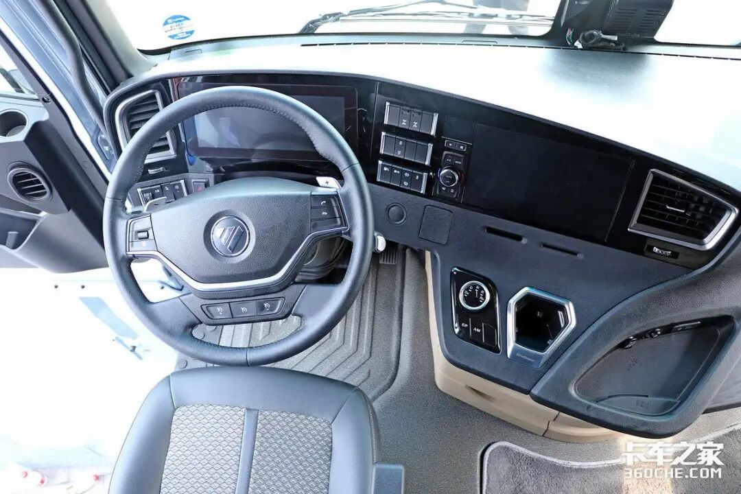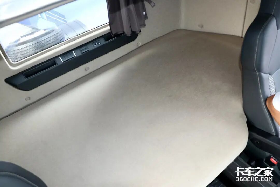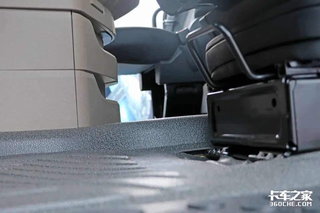 走近一步能够看到,平地板驾驶室对于高端重卡而言,必须得是标配。实拍车中间地台凸起尺寸适中,得益于旋钮式换档结构,座椅和卧铺间挪移非常方便,并且身高185cm也可在车内站直身体移动。