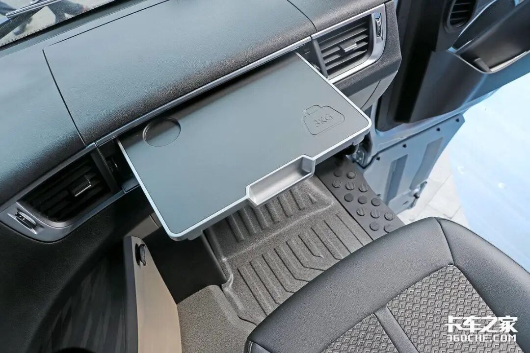 此外在副驾驶位置,实拍车也拥有两个贴心小设计,一是副驾前方中控台内置有一个承重3kg小桌板,方便卡友日常吃饭、记账使用。二为副驾驶座椅坐垫支持翻折,也有利于拓宽驾驶室内部空间。
