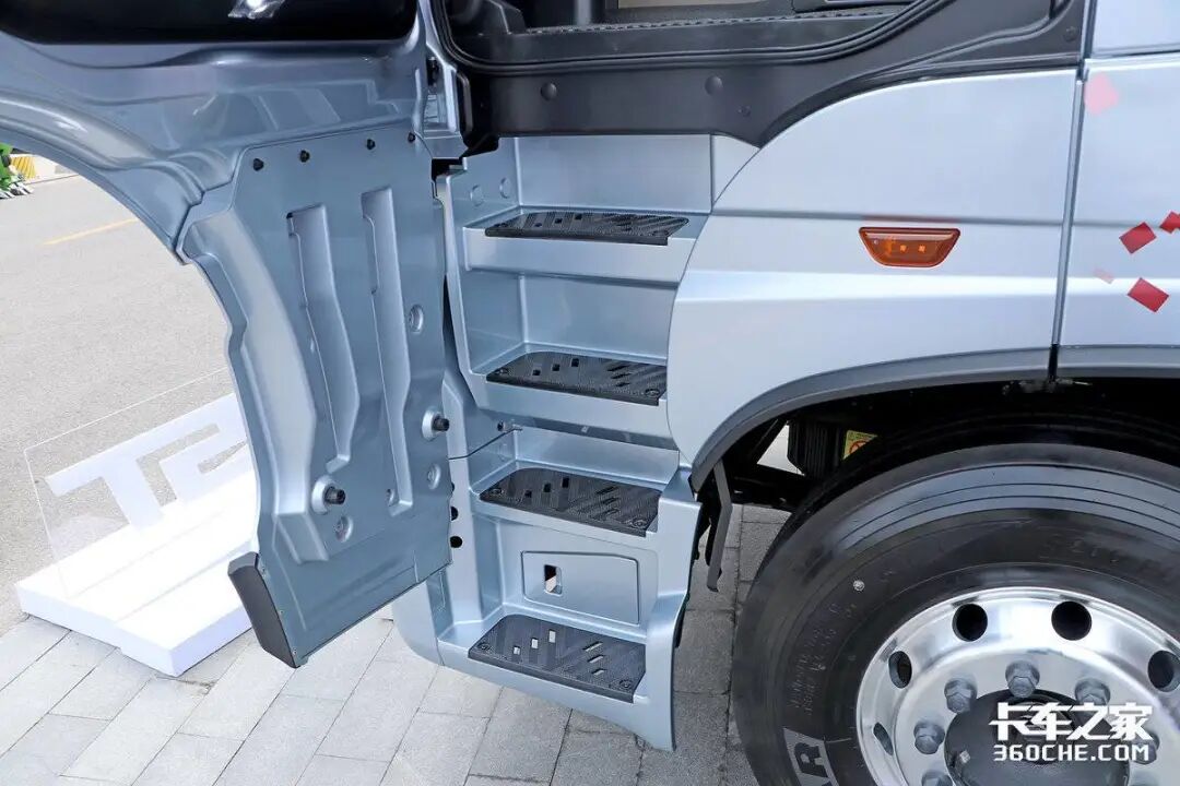 因为高大的驾驶室设计,所以在打开车门后,能够看到车辆采用了四级登车踏板设计,并且上三级车门能够被车门紧紧包覆住,有利于优化风阻和提升内饰干净程度。不过最上两级踏板横向宽度不大,会对登车便利性有些许影响。