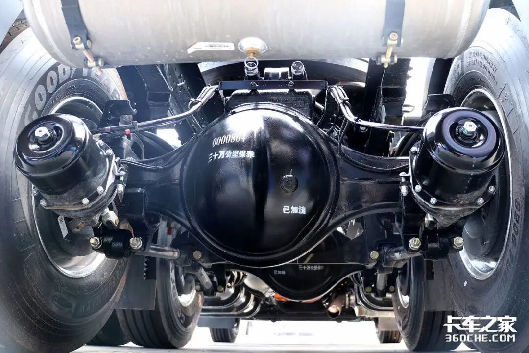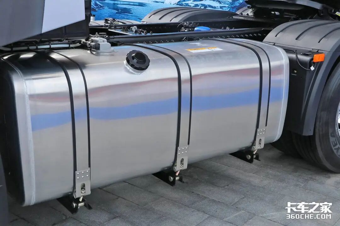 续航方面,实拍车适配有850L+350L双加热油箱,场景适用性更强,并且如果按照常见31L/100km油耗计算,1200L双油箱也能为整车提供超过3800km的续航里程。