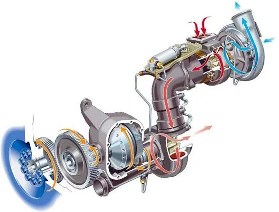 普通版车型的发动机在排出废气时,一部分废气会推动涡轮增压,另一部分则直接排出车外,这是常规操作。然而,在TC车型上,由于全新的复合涡轮增压器的应用,废气在进入涡轮后会有一部分用于发动机的增压,同时另一部分废气通过涡轮及传动机构驱动曲轴。