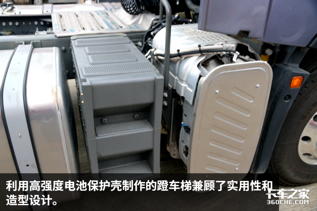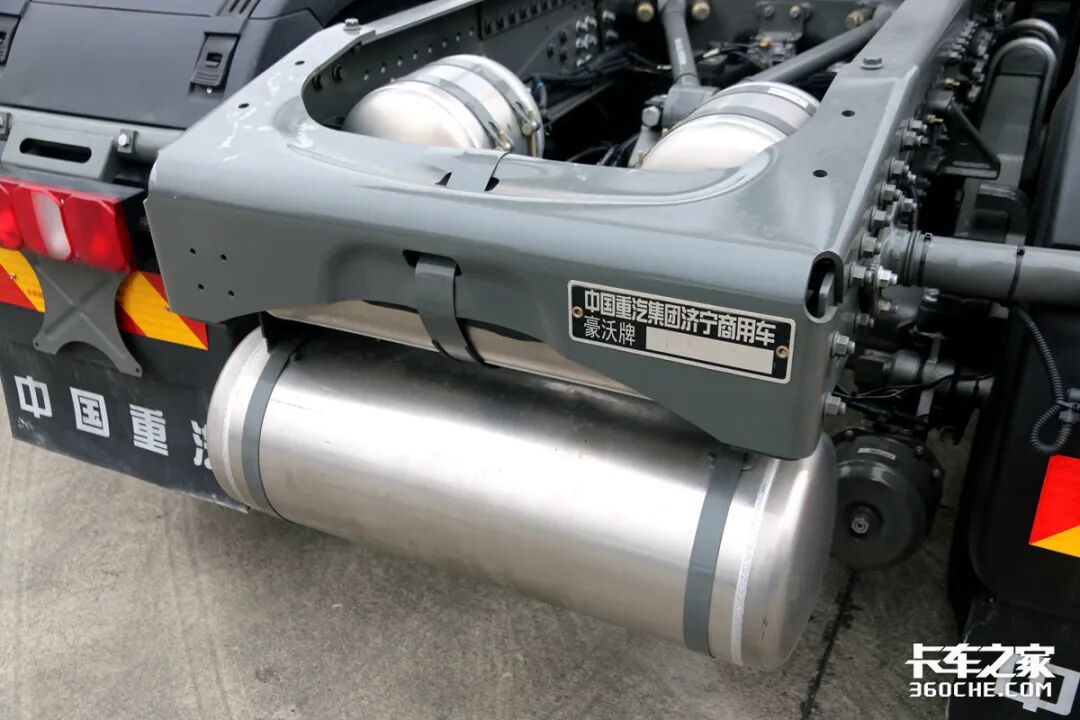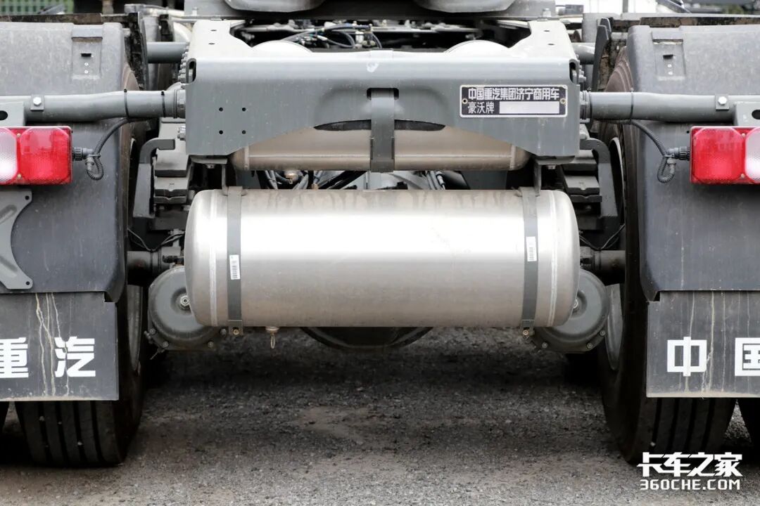 可以看到,豪沃MAX为了最大程度的利用底盘上的容积,将全车储气筒都放置在车辆大梁后方。进入国六时代,即便是牵引车这样庞大的底盘结构,也要为了节约底盘空间去容纳更大的油箱和后处理。