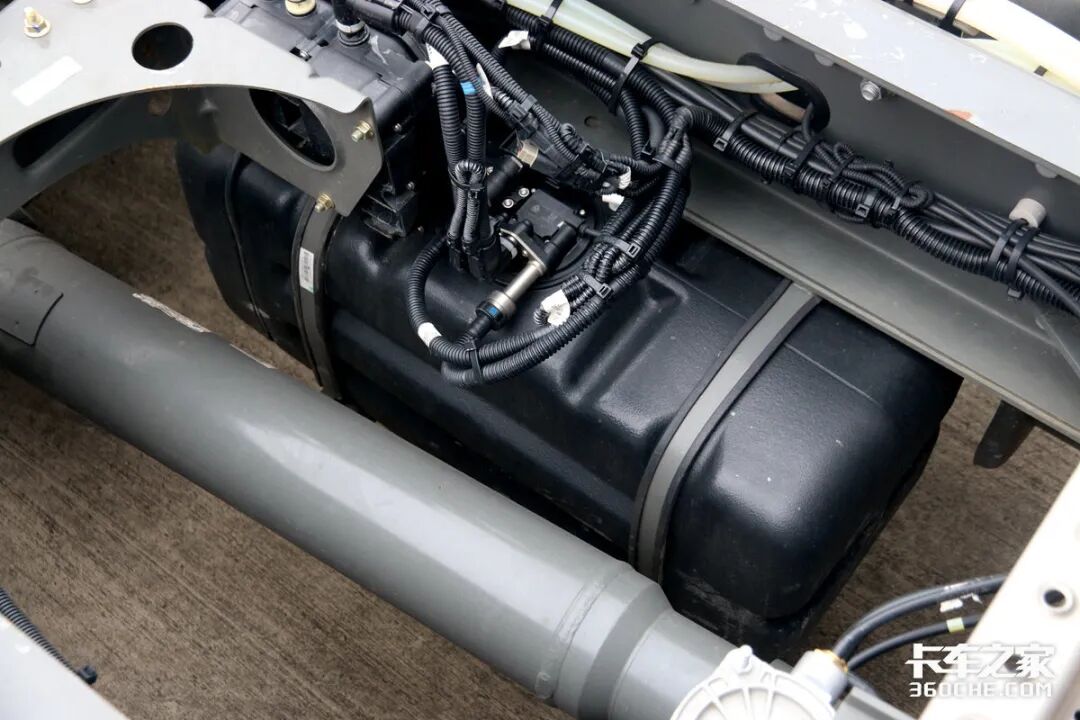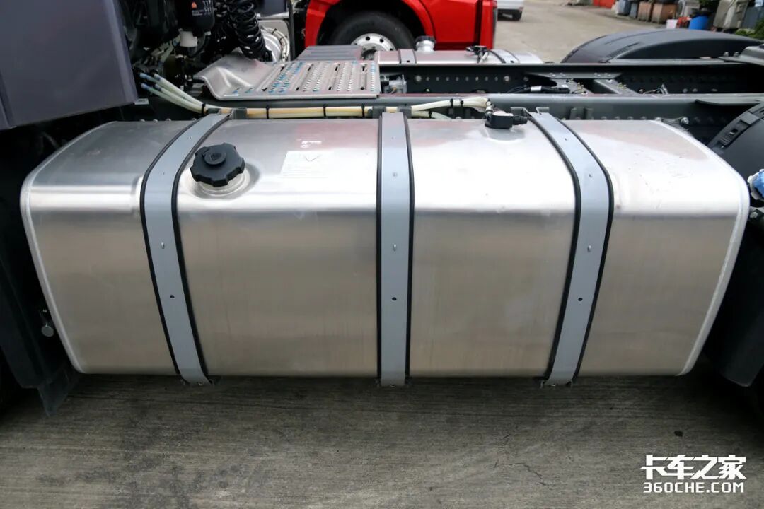 在油箱方面,实拍车型采用了主副油箱的设置,总共容积达到了1260升,可以为豪沃MAX提供接近4000km左右的续航里程,即便是跨越多省的干线运输也不在话下。为了达到这种大容积,豪沃MAX将尿素罐放置在了大梁内部,以此将主油箱的容积进一步延伸增大。