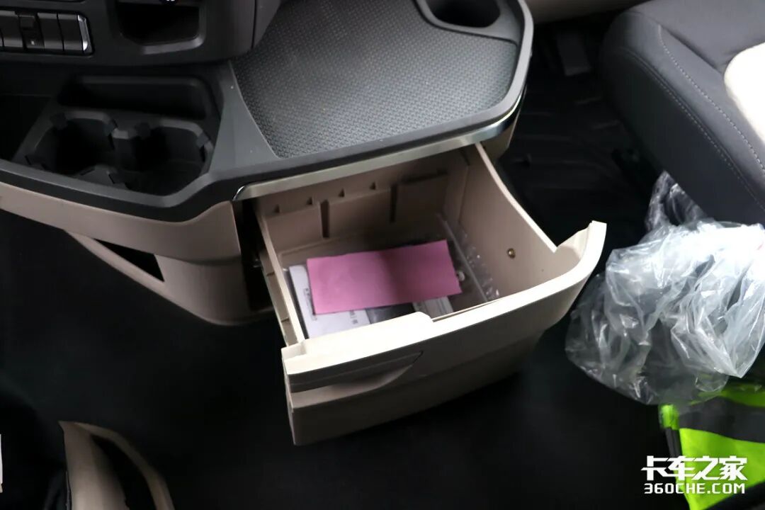整个驾驶室采用了近平地板的设置,卡友日常左右互通非常方便,中间区域除了杯架外,还设置了一个尺寸较大的操作台,放置电饭煲、笔记本电脑等物品都不在话下,下方拥有一个尺寸和深度都巨大的储物格,放一些随身衣物十分轻松。