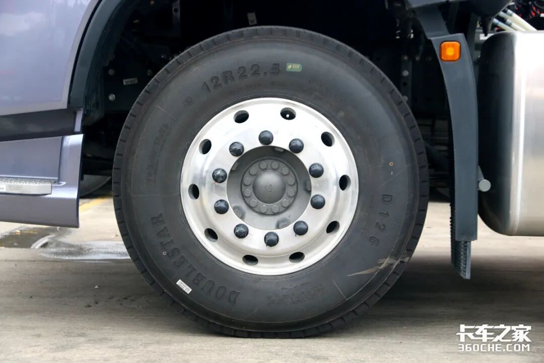 实拍车型选用了双星品牌的D 126系列轮胎,这款轮胎主打公路运输,是性价比较高的选择。轮胎尺寸为12R22.5,并且在前桥使用了珀然的铝合金车轮,对于整车减重有着较好的帮助。
