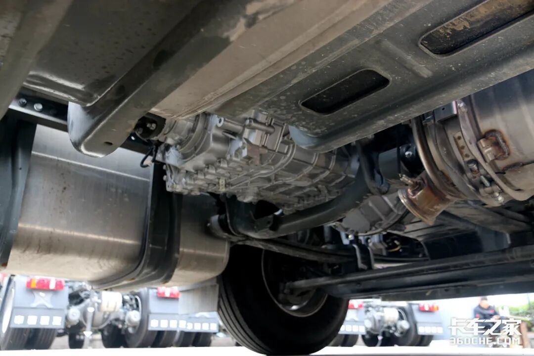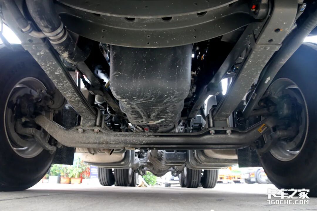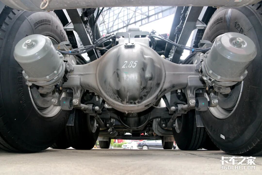 底盘方面,实拍车型采用了前2后5的钢板悬架设定,整体的底盘空间非常紧凑,展示了重汽较为优秀的制造工艺。后桥速比为2.85,经过卡车之家车速计算器计算,在豪沃MAX以1200rpm巡航前进时,其最高时速可达83km/h,其运输效率相当可观。并且还提供多种速比可选。