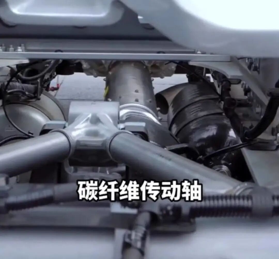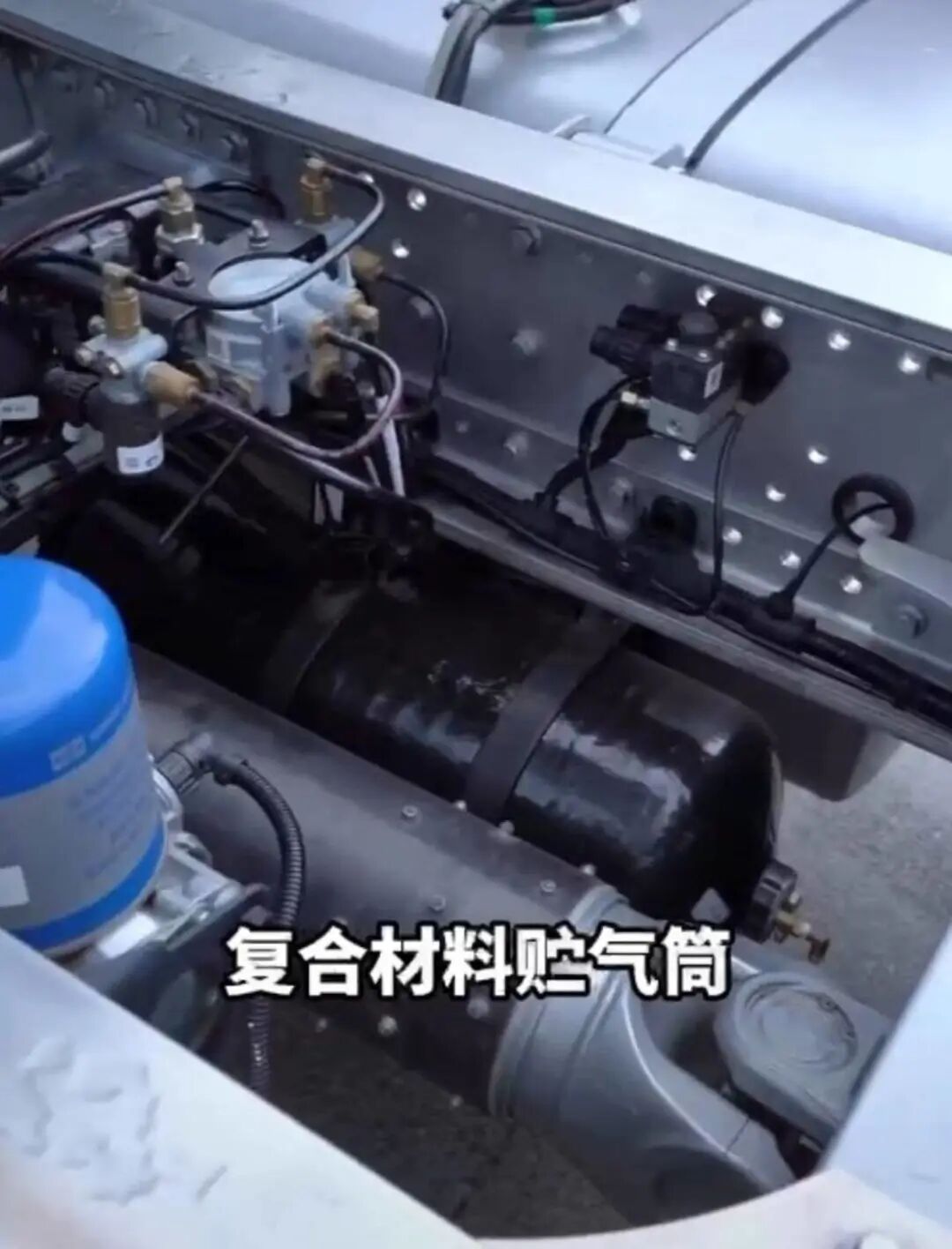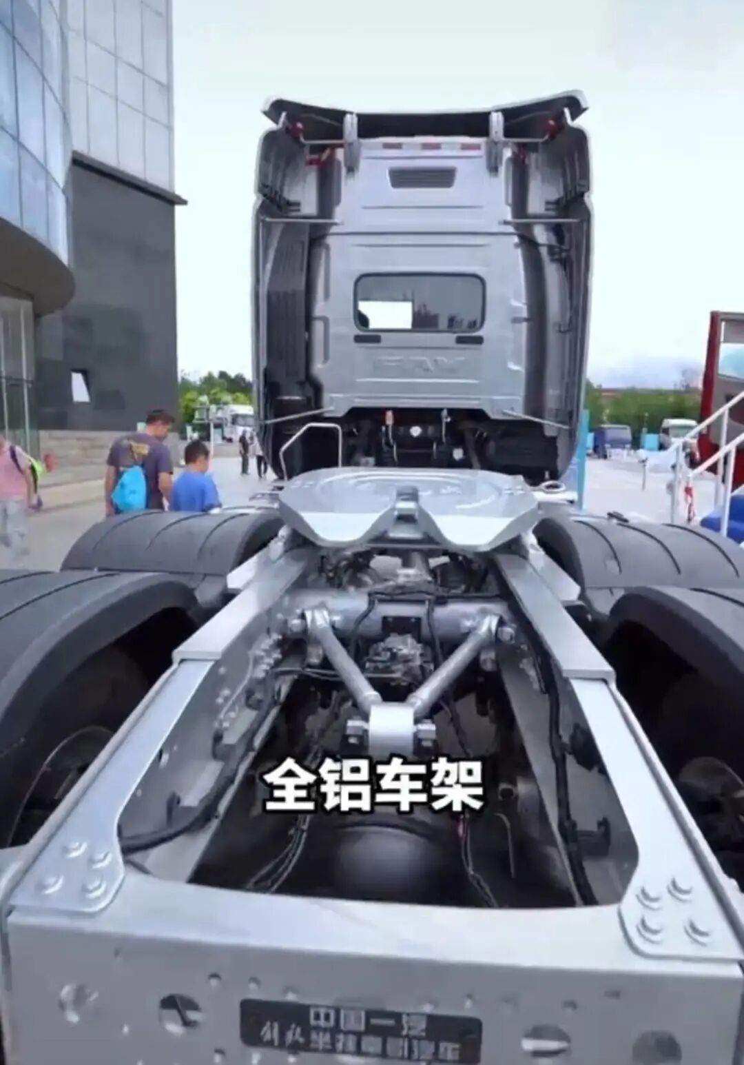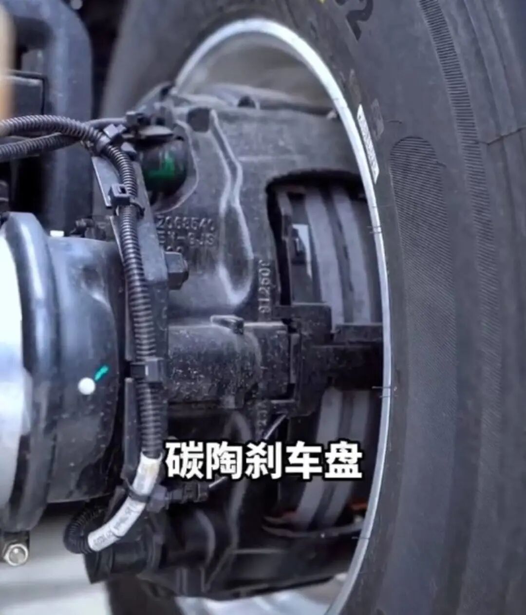 实拍的这台解放J6V整车采用全铝合金车架、铝合金油箱、铝合金轮圈以及铝合金蹬车踏板等等,除此之外,车辆的储气筒材质改为了质量更轻的复合材料,车辆的刹车盘也更改为乐碳陶材质,车辆的传动轴更是采用了质量更轻的碳纤维材料,在保证车辆强度的同时,也将车辆自重控制到了6.85吨,可以说是将轻量化做到了极致!