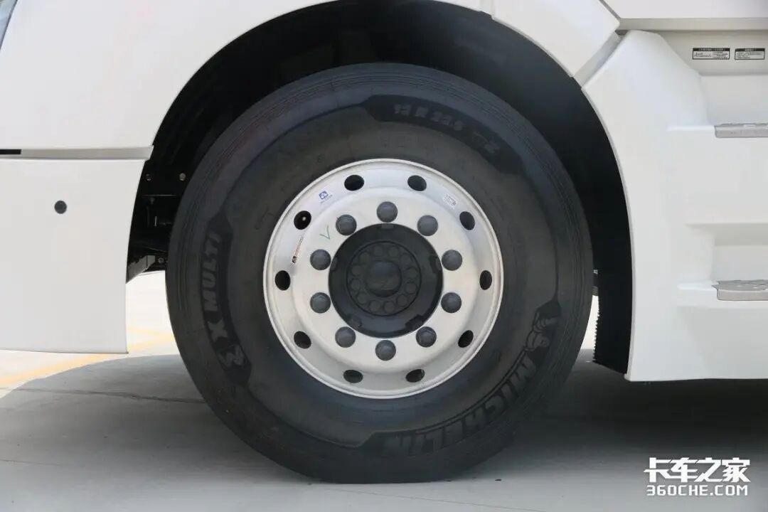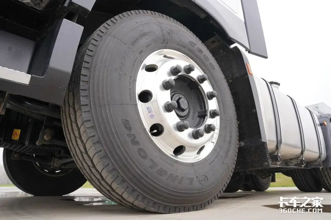 这台欧曼EST星辉版的油箱总容积达1000升(双油箱设计),并且实拍车全车装配的轮圈都是铝合金材质,轮胎也选择了固特异的低滚阻轮胎,滚动阻力可下降20%。悬挂方面,这台车采用的是前后两片板簧悬架的形式,有需求的卡友也可选择空气悬架。