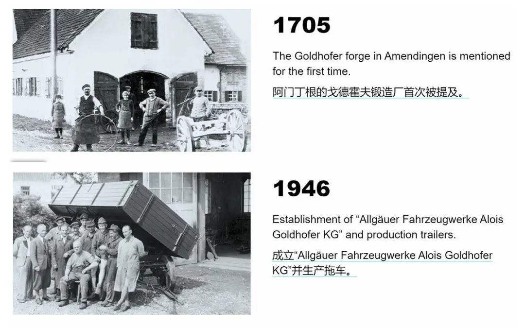 在1946年,Goldhofer正式宣布成立,并开始着力于拖车的生产,从这一历史图片来看,似乎是一辆带侧翻功能的小型全挂拖车。历经多年的发展,这一小型锻造厂已经发展成为拥有800多名员工的全球性企业。除了位于梅明根的总部外,Goldhofer集团还在德国、印度、英国、乌克兰、美国和阿拉伯联合酋长国设立了子公司和工厂,主要生产各型重型特种运输车辆,在全球范围内享有极高的盛誉。